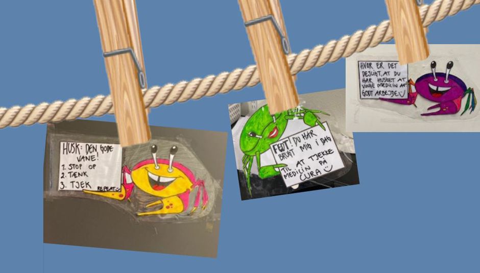 For at blive bedre til at dokumentere medicingivningen i it-systemet, har de to tovholdere stillet en tablet op i medicinrummet med en krabbe, der siger: "Fedt du har brugt mig i dag til at tjekke medicin på Cura (it-system)".