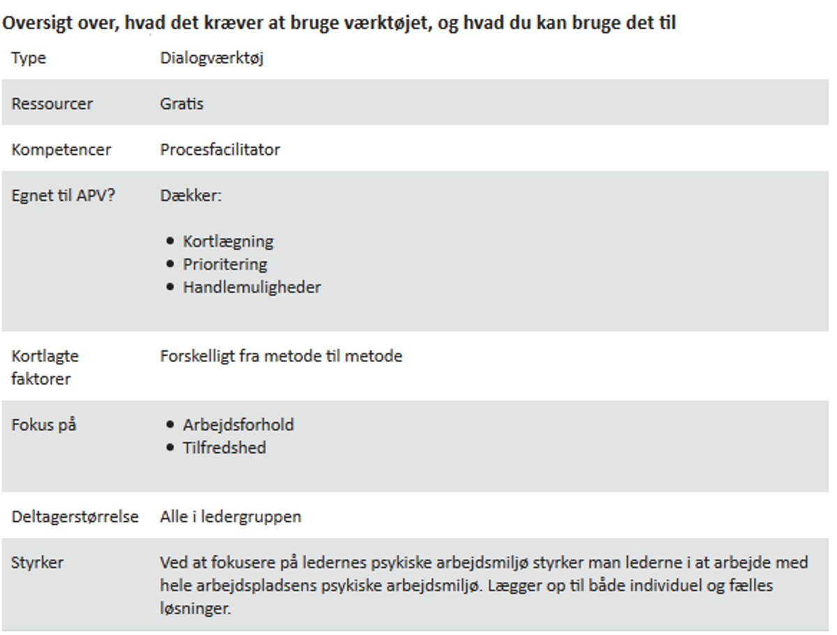 'Lederens egen APV' er et ud af fire værktøjshæfter, der kan bruges som ”Hjælp til selvhjælp” for ledere i hele social- og sundhedssektoren. Værktøjerne kan også anvendes af SIO/MED-udvalgene til at sætte fokus på og rammer for ledernes psykiske arbejdsmiljø.
